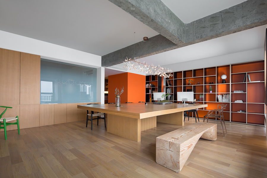 切換一個角度看看會議室內(nèi)部,整體以木材為裝飾主材,地面上淺淡的木地板配上木質(zhì)造型長凳,就算在討論時觀點(diǎn)再激烈,就算會議時間再冗長也能讓人放松下來。因?yàn)槟?,夠溫和?/p>