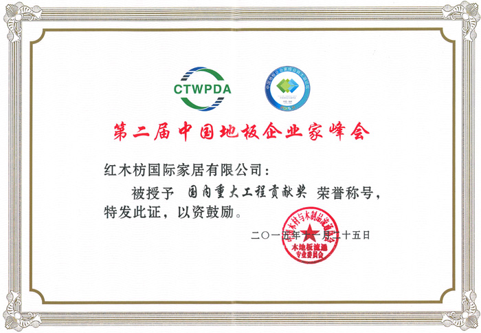 2015年11月25日,由中國木材與木制品流程協(xié)會主辦,主題為“審時度勢和衷共濟(jì)”第二屆中國地板企業(yè)家峰會在浙江湖州開元名都大酒店隆重召開。來自全國各地200余家優(yōu)秀企業(yè)家及業(yè)界專家代表出席本次會議。紅木枋地板作為行業(yè)新秀應(yīng)邀參加本次高峰會議。并獲得“中國地板行業(yè)科技創(chuàng)新獎”和“國內(nèi)重大工程貢獻(xiàn)獎”兩項(xiàng)殊榮。這是行業(yè)對紅木枋地板的最高禮遇,也是激勵紅木枋地板實(shí)現(xiàn)夢想,不斷前進(jìn)的利器。