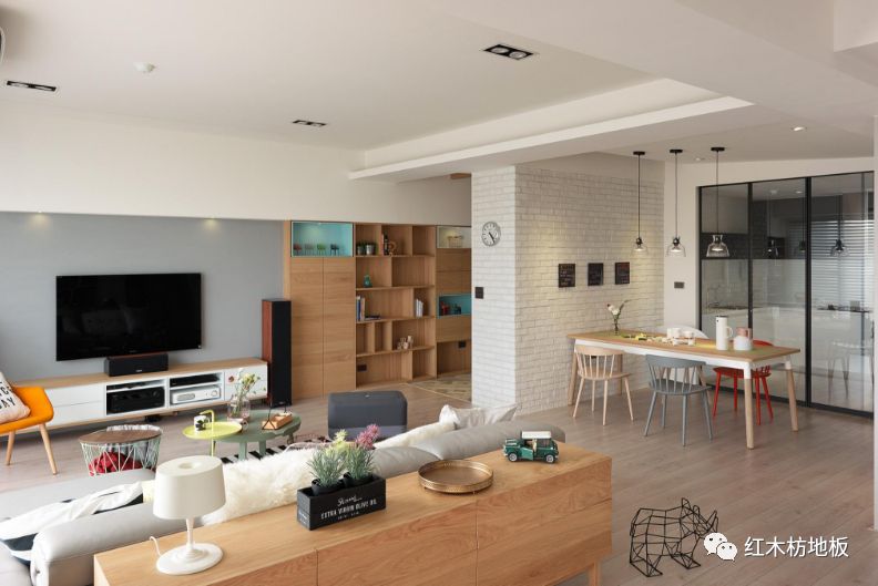 陽(yáng)光與地板的邂逅,令簡(jiǎn)潔明快的現(xiàn)代空間,流淌了一絲溫暖和潤(rùn)的氣息。